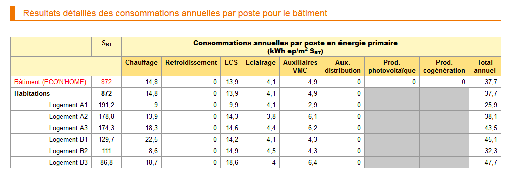 Le calcul RT2012 s’appuie sur les outils conçus par le CSTB, et des données standardisées : météo, usages, températures de consigne. Souvent éloigné de la réalité, ce calcul est toutefois obligatoire. Le tableau suivant issu de la synthèse standardisée résume les consommations primaires par poste.
