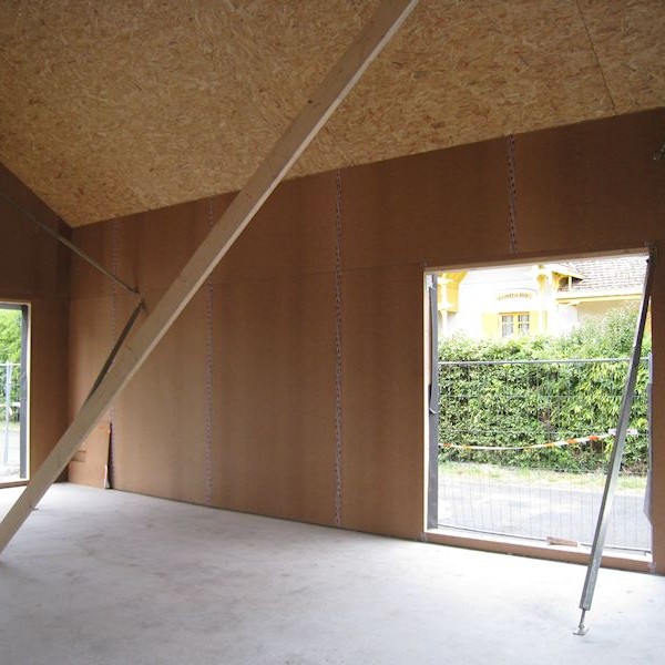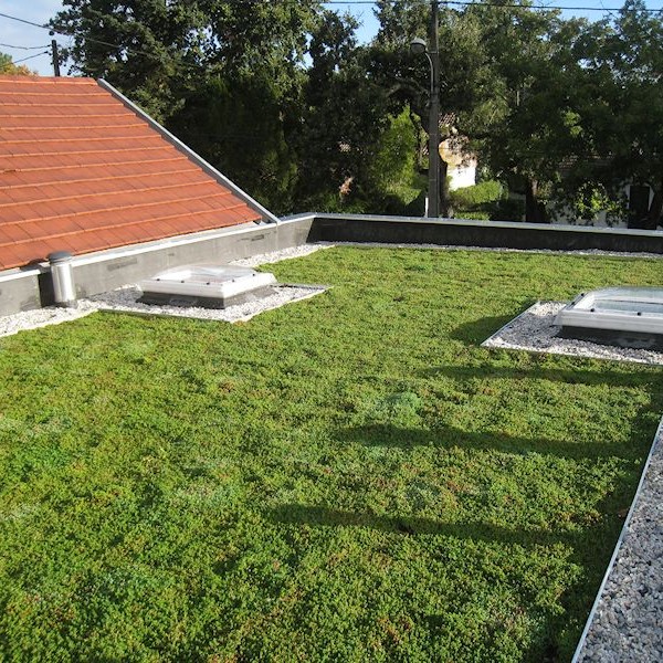 Toiture terrasse végétalisée, avec 300 mm de ouate de cellulose + 80 mm de fibre de bois rigide en pare pluie extérieur. Menuiseries double vitrage chassis bois isolant FE/Argon (Uw de 1.15 W/m².K), très bonne étanchéité à l’air mesurée à n50 inférieur à 0.6 vol/h, ventilation double flux HR Novus 300.