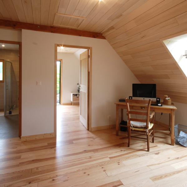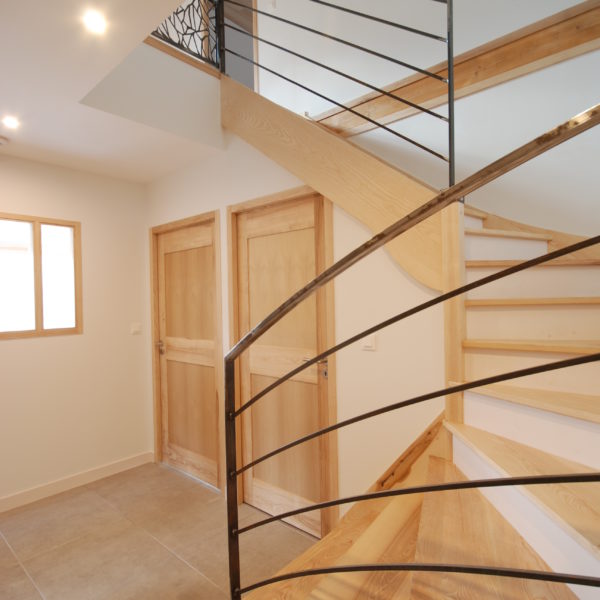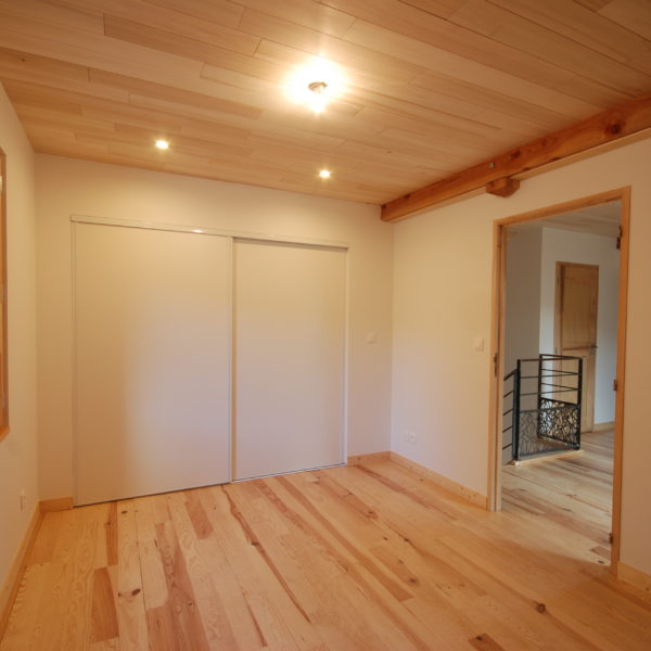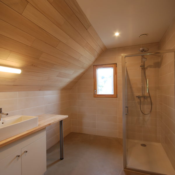 - en ossature 220 mm (contreventement intérieur en panneau de bois) isolation ouate de cellulose, un complément d’isolation extérieur de 60 mm de fibre de bois est prévu ainsi qu’un complément de 40 mm dans le doublage technique intérieur.