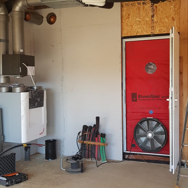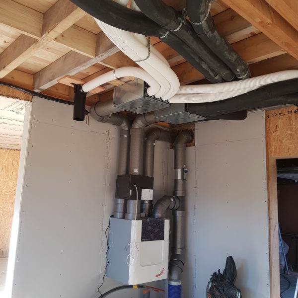 - La ventilation de la maison sera assurée par le modèle Comfoair 350 de marque ZEHNDER rendement certifié 87%. L’objectif sur le niveau d’étanchéité l’air passif (n50 = 0.6 Vol/h, Q4 = 0.16 m3/h m2) est impératif sur le projet qui vise la certification Maison Passive France.