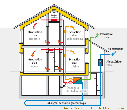 - Un grand confort thermique : via l’absence de parois froides, température homogène, bon renouvellement d’air (débits de confort, pas de courants d’air)
